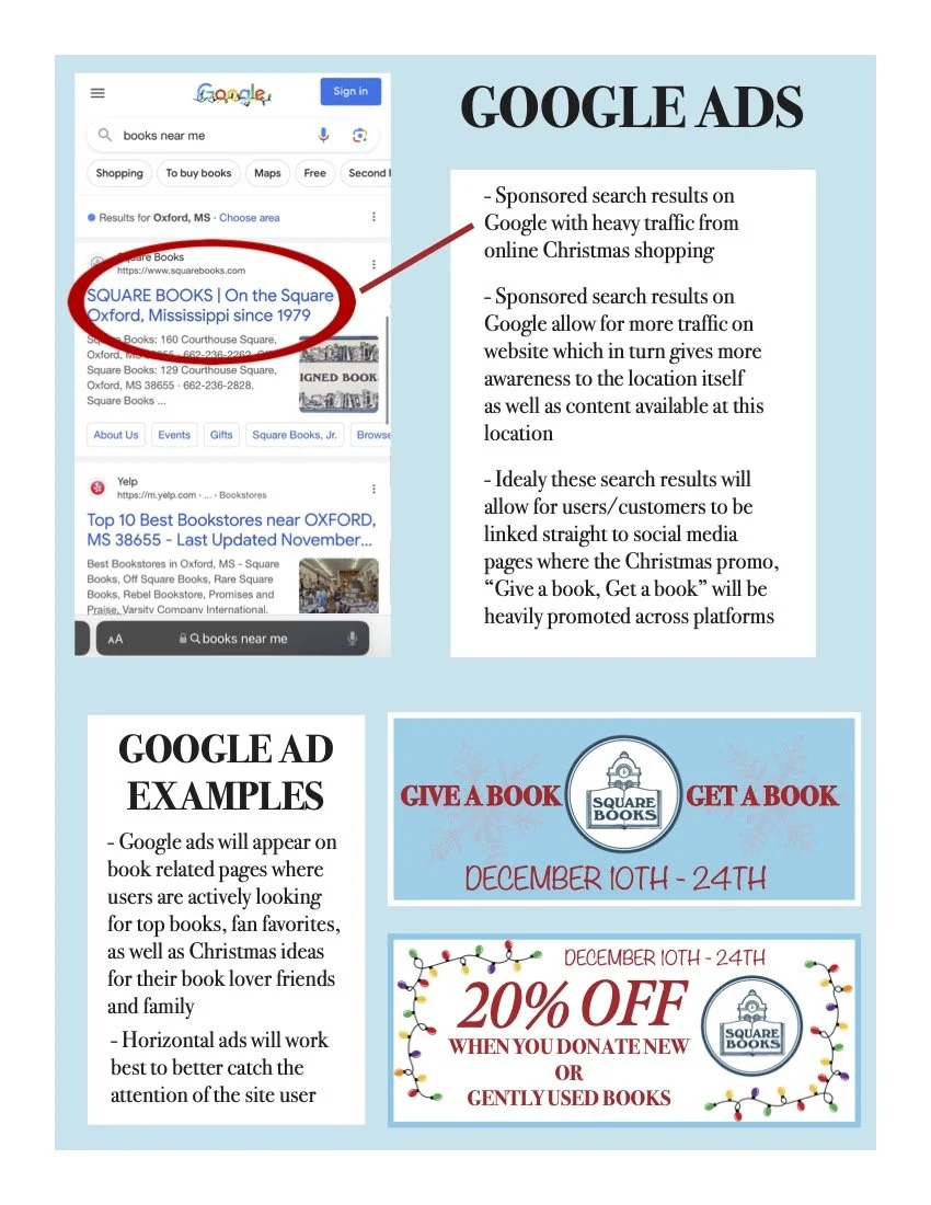 This specific event was designed for a local bookstore in Oxford Mississippi to promote holiday sales and bring relevance to the print world. The event campaign brief was designed using Adobe InDesign and Photoshop.